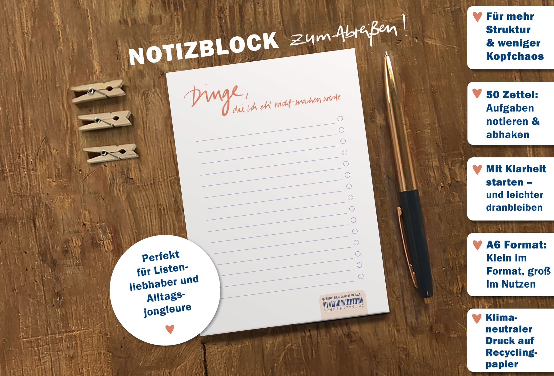 Ein handlicher Listenblock, der alles Überflüssige weglässt und nur das lässt, was hilft: klare Linien, kleine Kreise zum Abhaken und ein Format, das überall hinpasst. Die überspitzte Headline regt vielleicht sogar dazu an, die Dinge erst recht anzugehen. Dazu nachhaltiges Recyclingpapier und klimaneutrale Produktion in Deutschland.