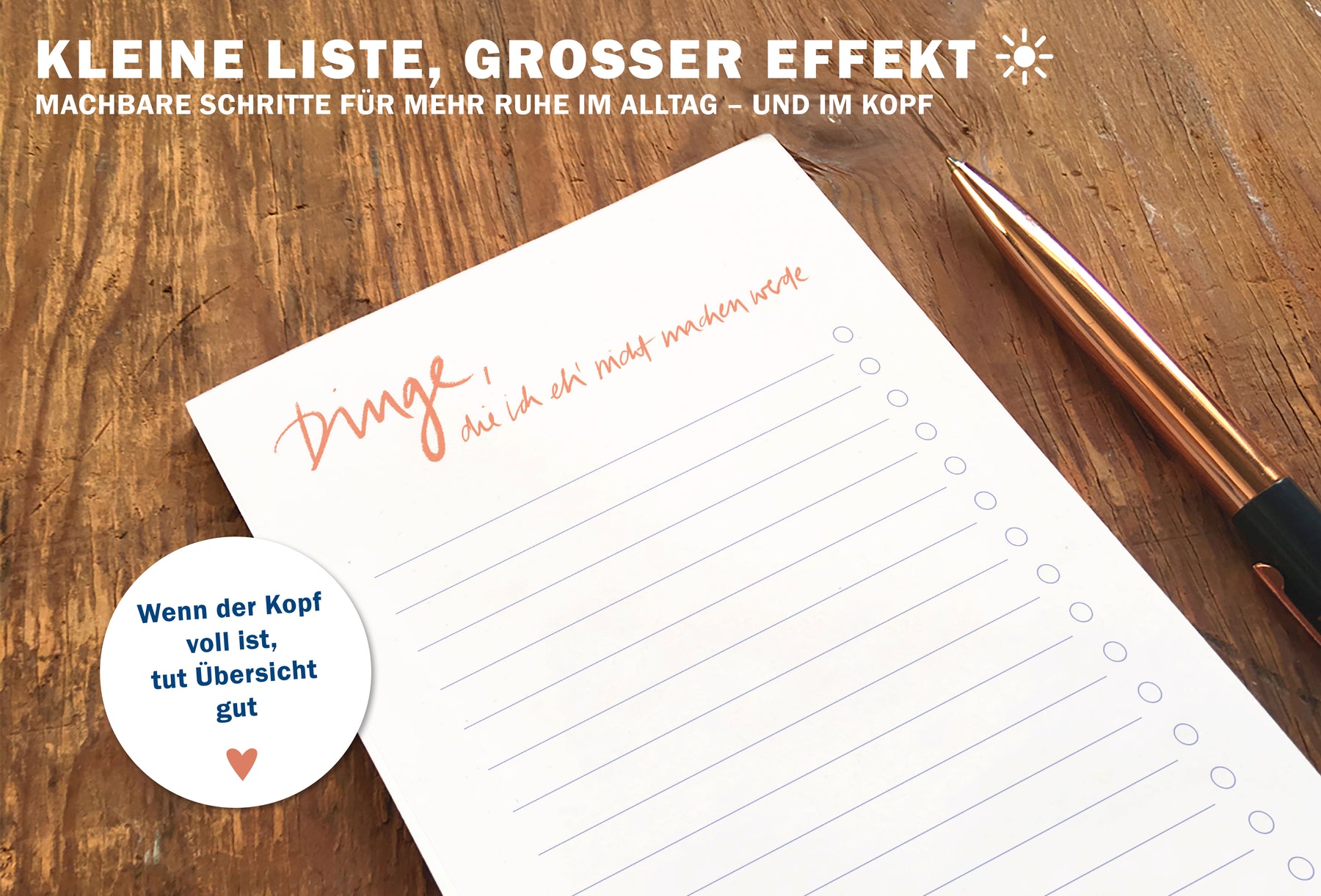 Block aufschlagen, alles draufschreiben, was du ewig schiebst: Anrufe, Mails, Papierkram, kleine Alltagsdinge. Ein Blatt für den Tag, eines für die Woche, eines für „irgendwann“. Du reißt die Seite ab, nimmst sie mit oder legst sie sichtbar hin – und arbeitest dich Häkchen für Häkchen vor. Einfach, klar, ehrlich.
