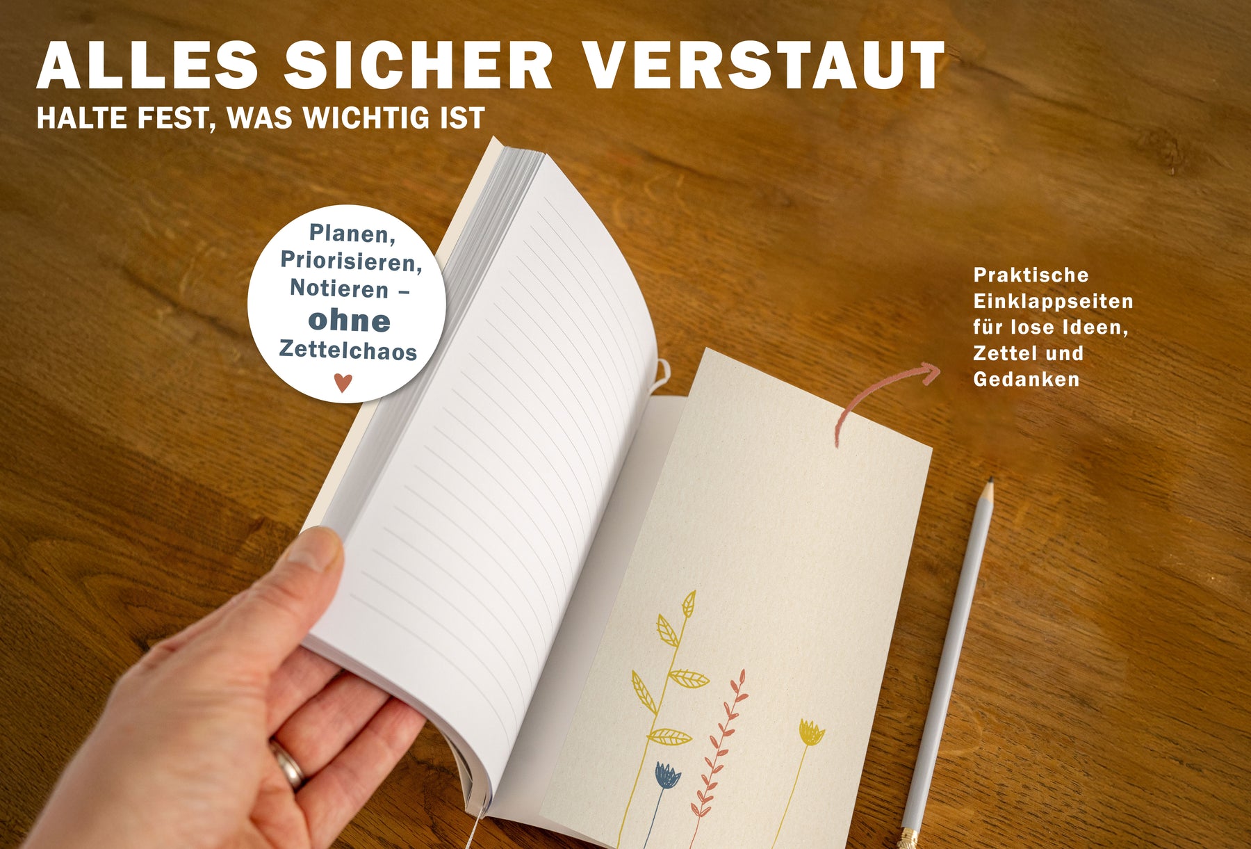 UMFASSENDER WOCHENPLANER: Alles drin und trotzdem ein echtes Leichtgewicht – finde Platz für Skizzen, Ideen und Notizen auf 13 blanko Seiten (liniert, dotted und mit Checklisten) hinten. Für die Notizzettel und Kärtchen, die dann doch immer lose rumschwirren, gibt's vorne und hinten praktische Einklappseiten.