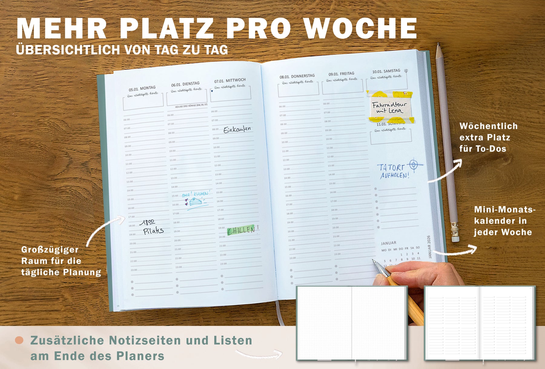 LANGFRISTIG DURCHDACHT: Behalte wichtige Termine und Fristen im Blick mit 4 Seiten Jahresübersicht 2026, Jahresplan 2027 und 12 Monatsübersichten inkl. Ferien & Feiertage (für Deutschland & Österreich).