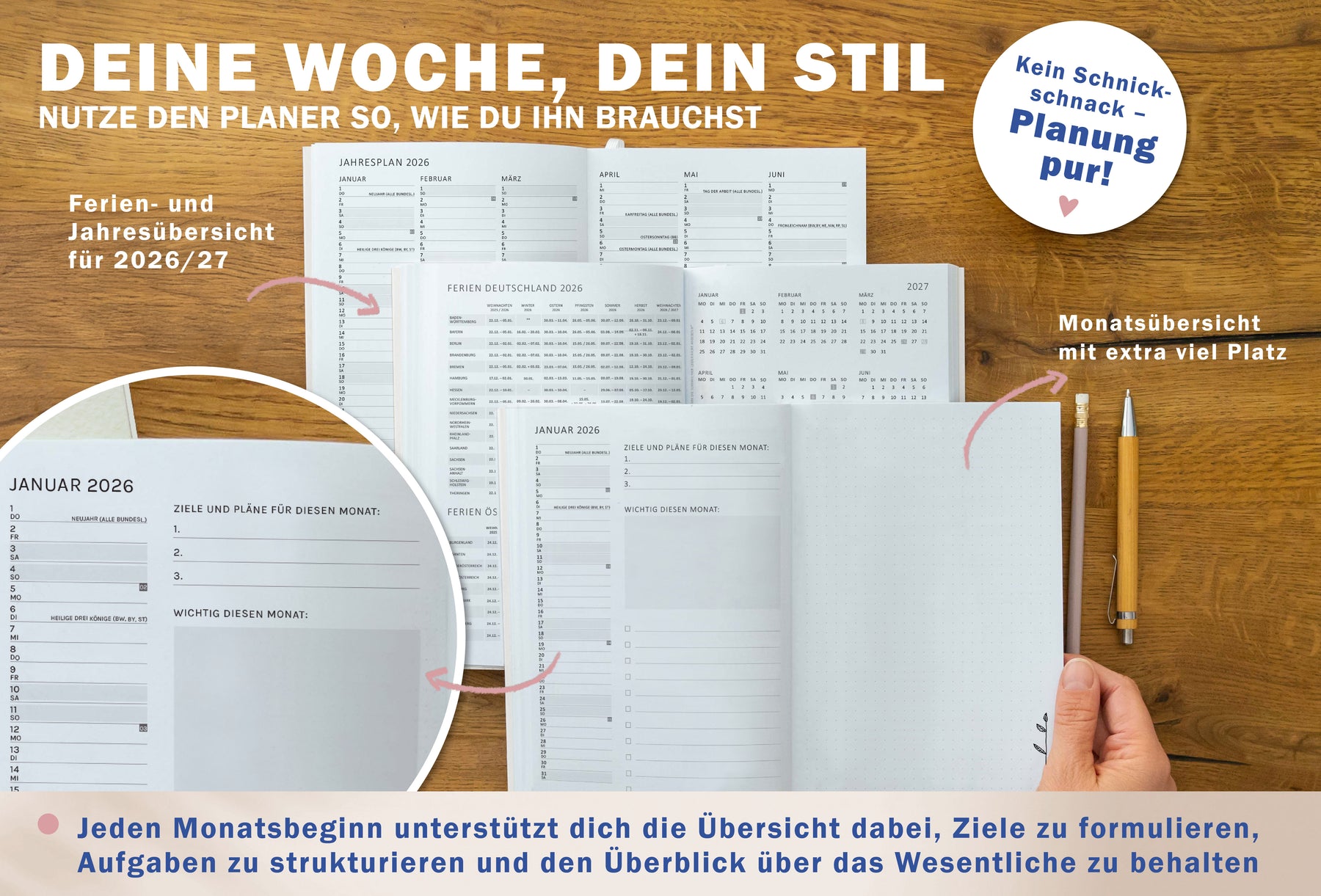LANGFRISTIG DURCHDACHT: Behalte wichtige Termine und Fristen im Blick mit 4 Seiten Jahresübersicht 2026, Jahresplan 2027 und 12 Monatsübersichten inkl. Ferien & Feiertage (für Deutschland & Österreich).