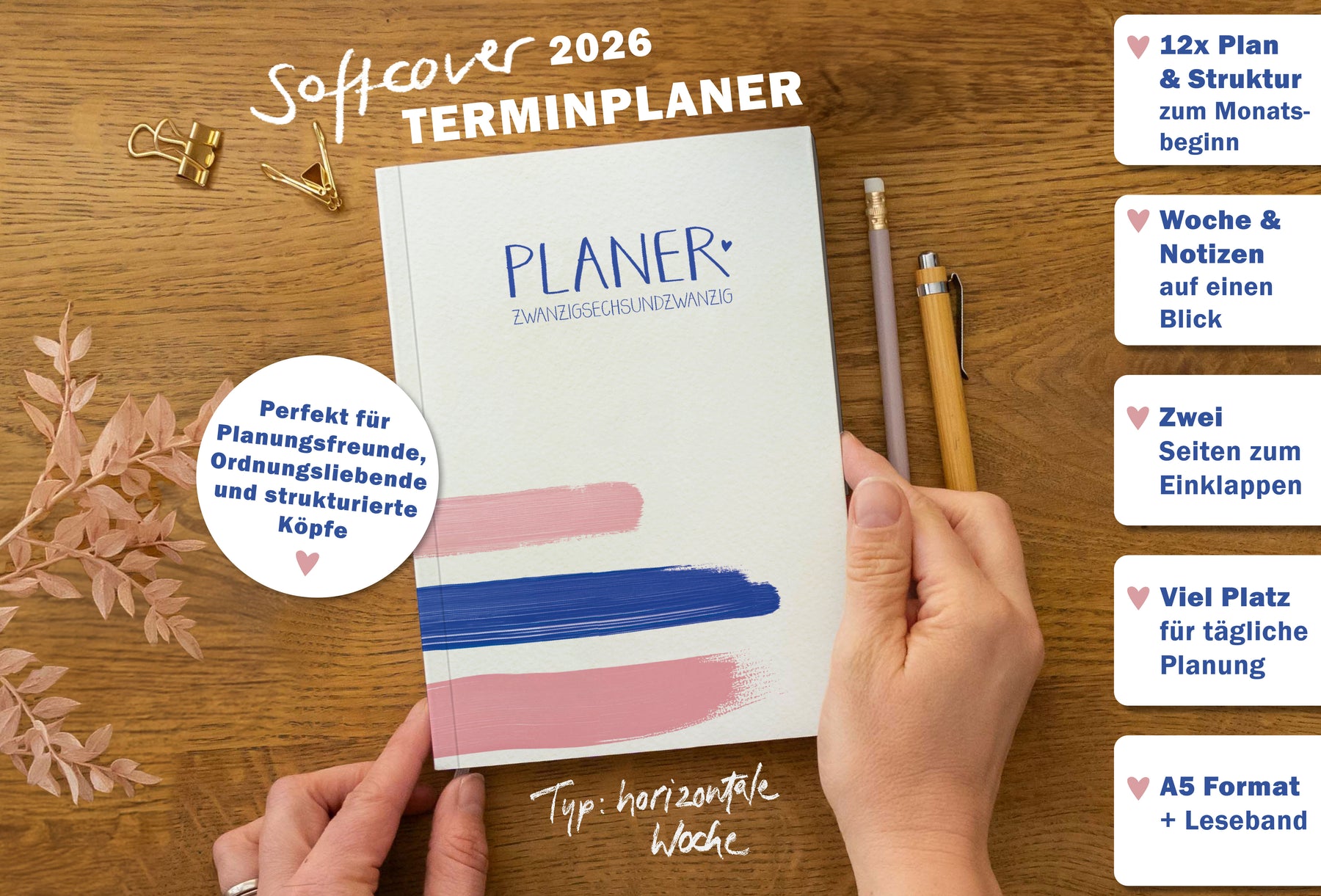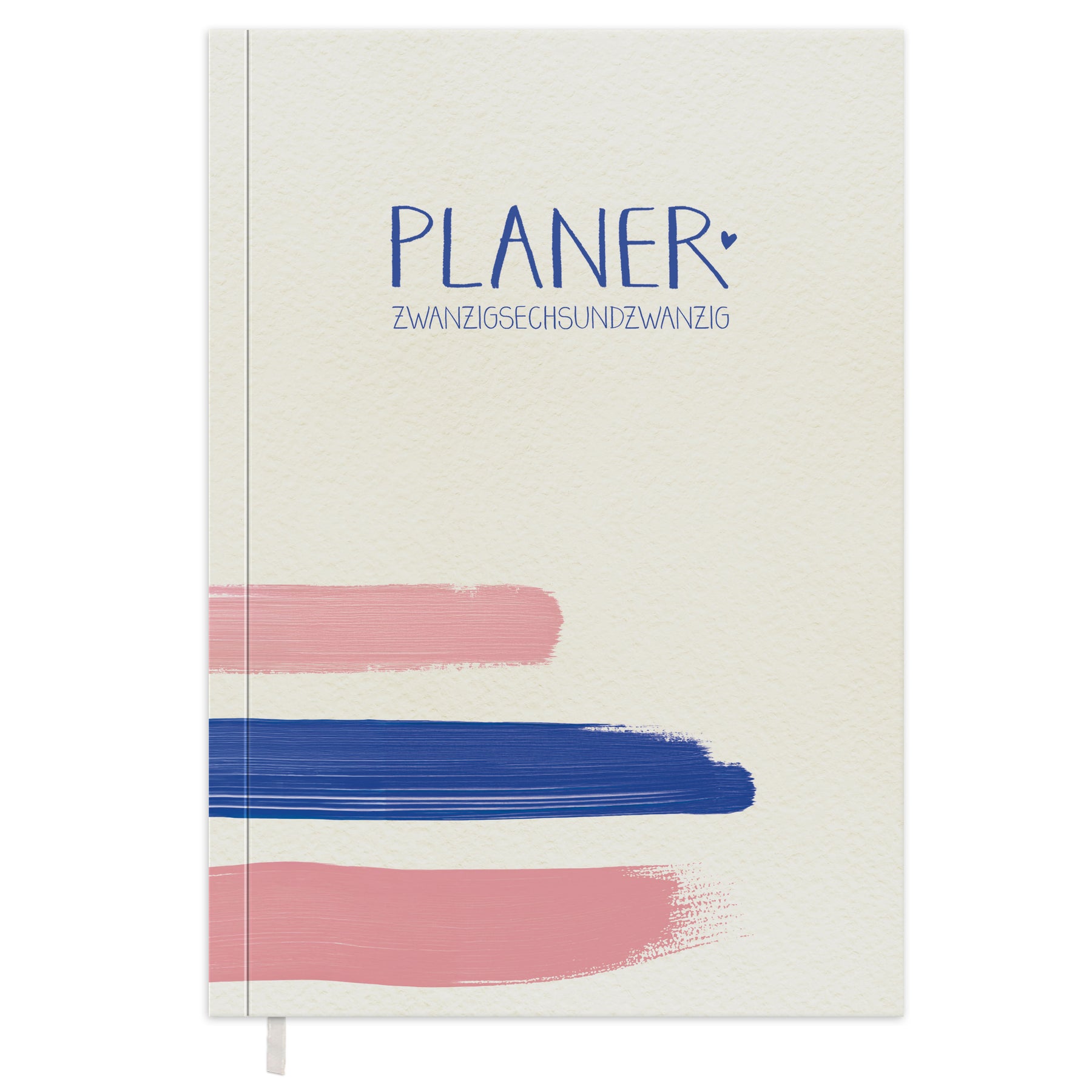 ÜBERSICHTLICH & KLAR: A5 Kalender 2026 mit Wochenübersicht im Zeilen-Layout, 2 Seiten pro Woche, flexibles Softcover mit eingeklebtem Lesebändchen als Schnellfinder, 152 Seiten, 120 g FSC Papier, CO2-neutral gedruckt, Creme-Weiß Blau Rosa.