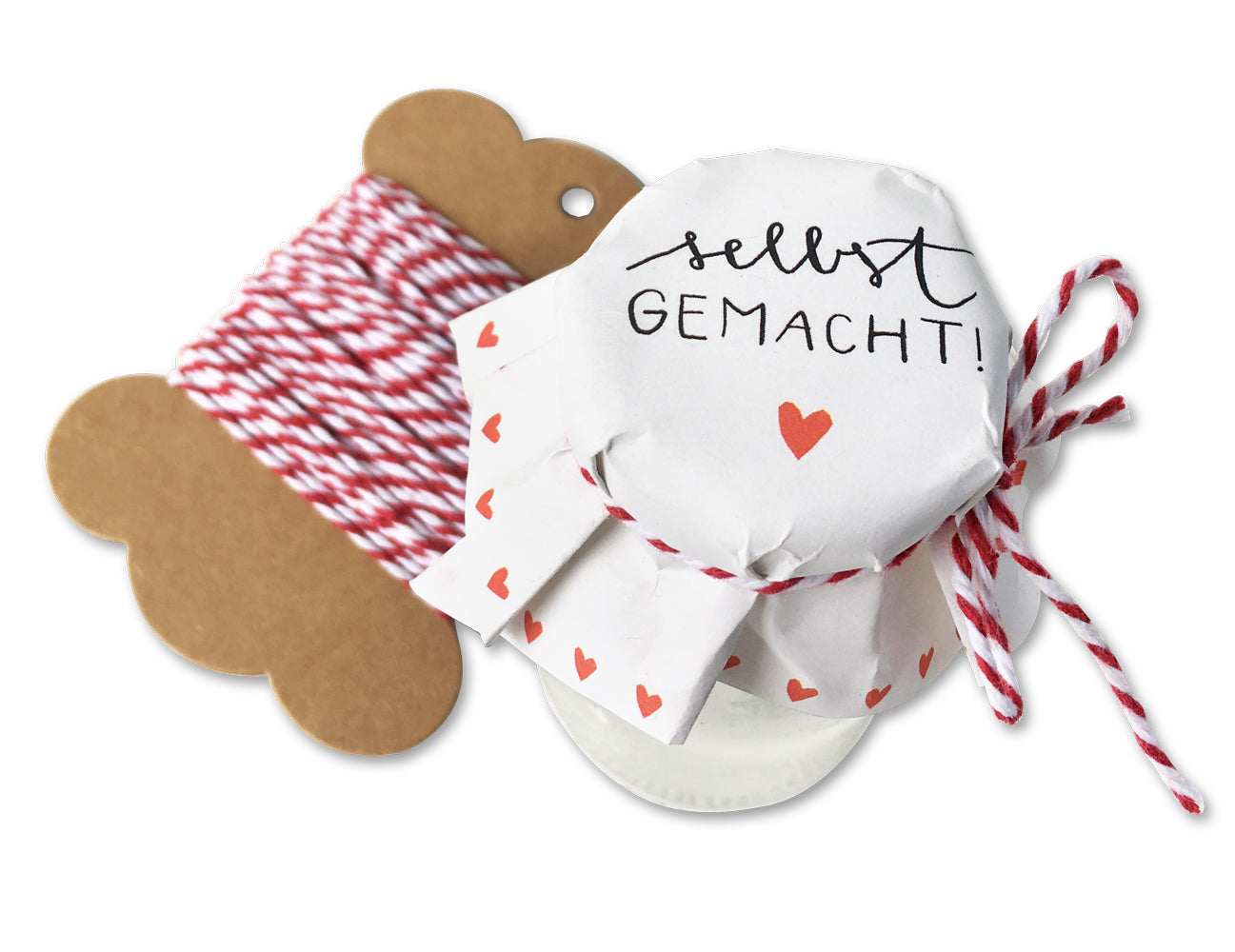 DAS BEKOMMST DU: Im Set einen Abreißblock kleine Marmeladendeckchen (10,50 x 10,50 cm) mit 25 Blatt umweltfreundlichen Recyclingpapier (klimaneutral gedruckt) in Weiß mit niedlichen roten Herzen, 10 m rot-weißes Küchengarn, 1 Justiergummi.