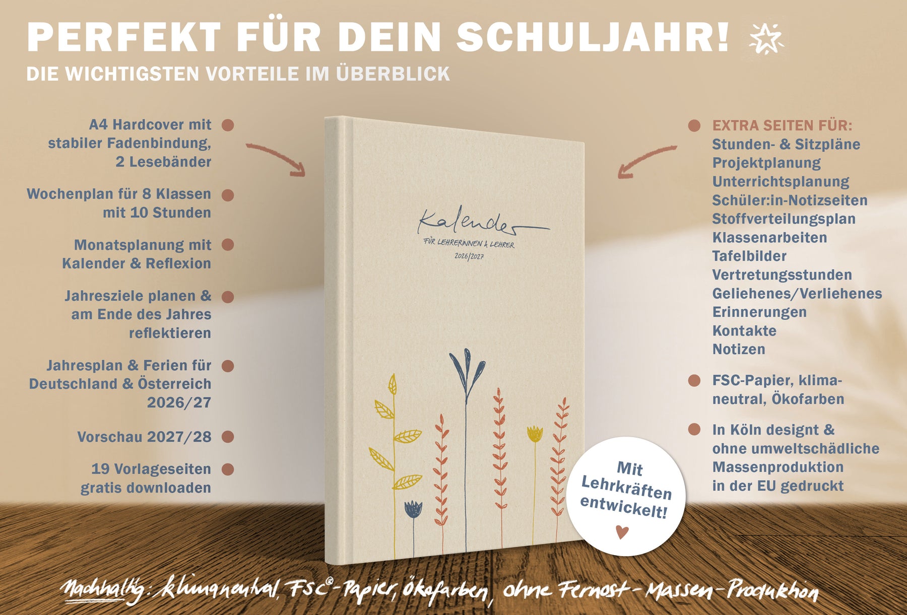 Mit Lehrkräften gemeinsam für Lehrerinnen und Lehrer entwickelt! Dieser Kalender navigiert dich souverän durch das Schuljahr 2026/27 – übersichtlich, kompakt und ohne Klimbim.