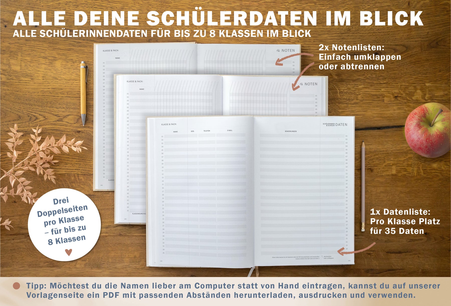 - SMART UND INSPIRIERT: 8 Schulklassen, praktische Jahres- und Monatsübersicht, Vorlage für Projekt- und Unterrichtsplanung, viel Platz für Kontaktlisten, Planung der Klassenarbeiten, Vertretungsstunden, Ideen und Selbstreflexion. Und falls du Beobachtungsbögen oder von einer Seite mehr brauchst, gibt's die bequem per QR-Code zum Ausdrucken :)