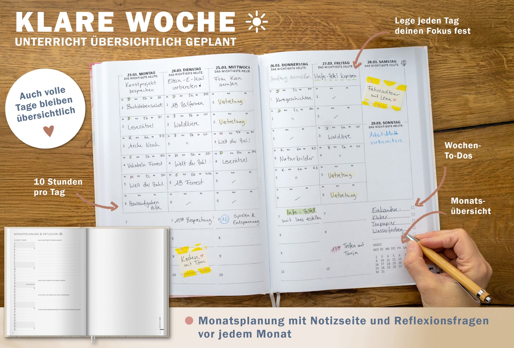- SMART UND INSPIRIERT: 8 Schulklassen, praktische Jahres- und Monatsübersicht, Vorlage für Projekt- und Unterrichtsplanung, viel Platz für Kontaktlisten, Planung der Klassenarbeiten, Vertretungsstunden, Ideen und Selbstreflexion. Und falls du Beobachtungsbögen oder von einer Seite mehr brauchst, gibt's die bequem per QR-Code zum Ausdrucken :)