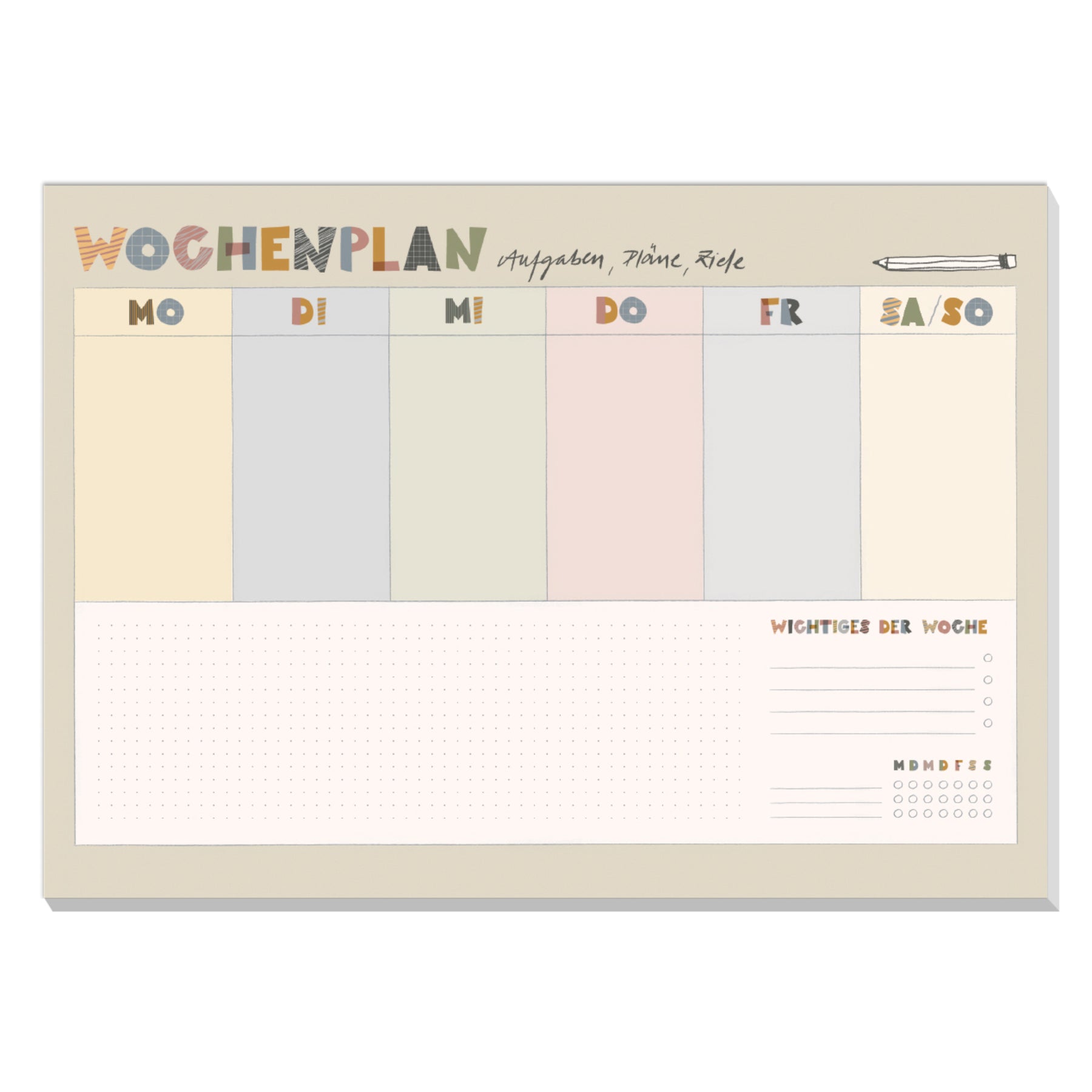 Montagmorgen, die Schule startet – und dieser Wochenplaner bringt sofort Struktur rein. Der A5-Abreißblock hat farbige Spalten für jeden Wochentag, dazu Platz für „Wichtiges der Woche“ und kleine Notizen.