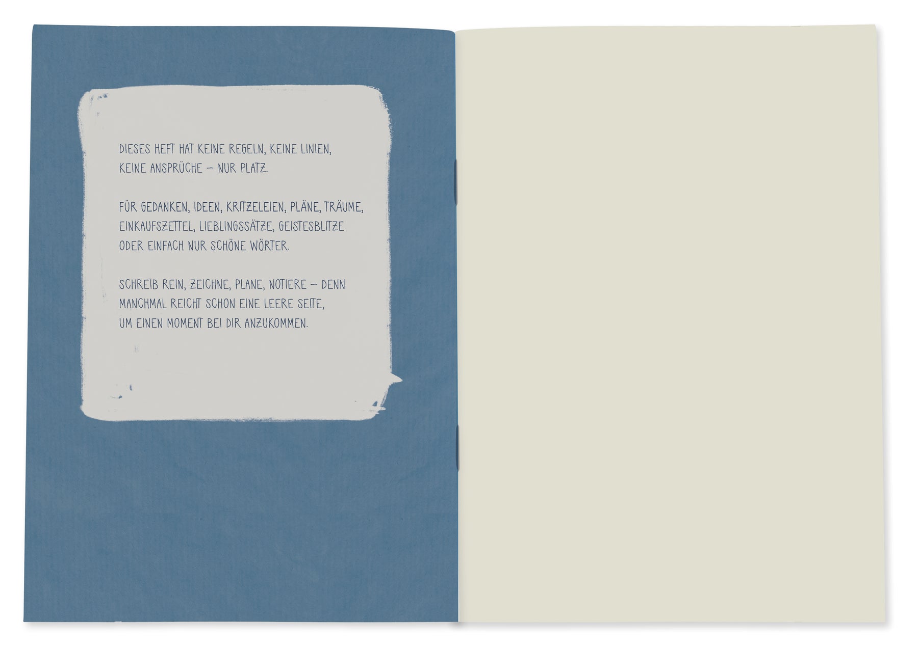 Das klare Blau auf dem Cover und die ruhigen Illustrationen erinnern daran, wie viel im Alltag entsteht, wenn man sich ein bisschen Platz schenkt. Für Skizzen, kleine Pläne, Einkaufszettel, schnelle Notizen oder Gedanken, die erst später Sinn ergeben.