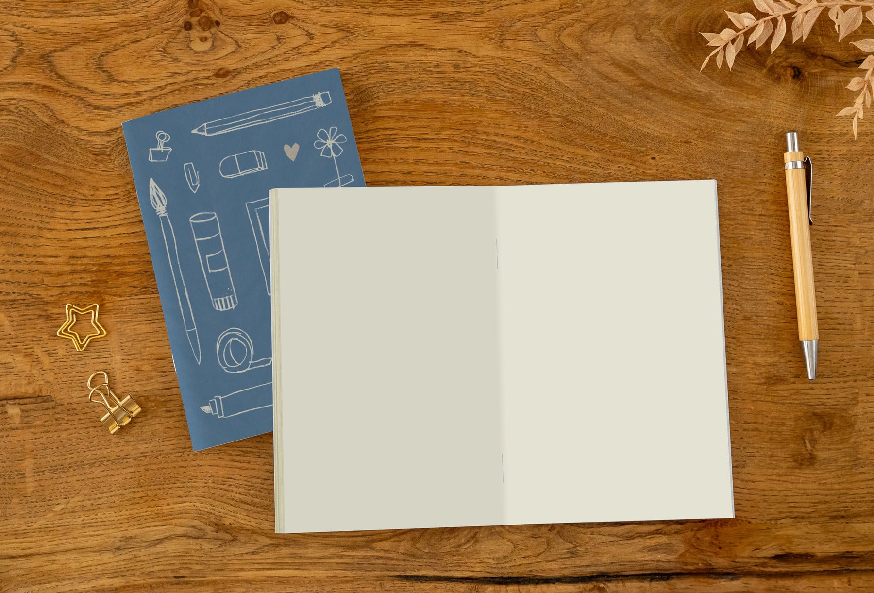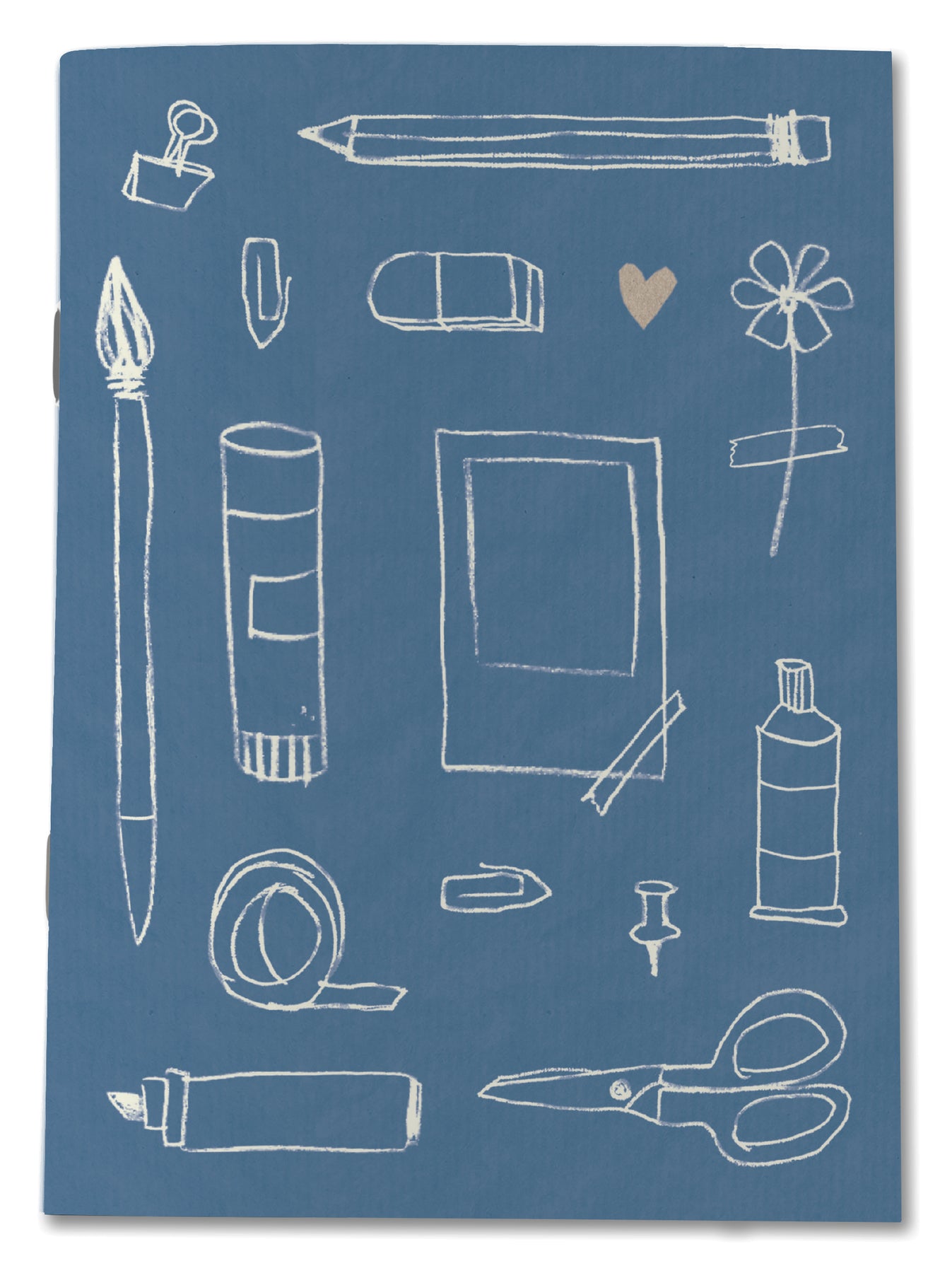 Notizheft in Blau Weiß mit Schreibutensilien Illustration, blanko, A5 (105 x 148 mm) Hochformat, Klammerheftung, 36 Seiten, Innenseiten 170 g/m² Recyclingpapier, Umschlag 250 g/m² Recyclingpapier, CO2-neutral gedruckt.
