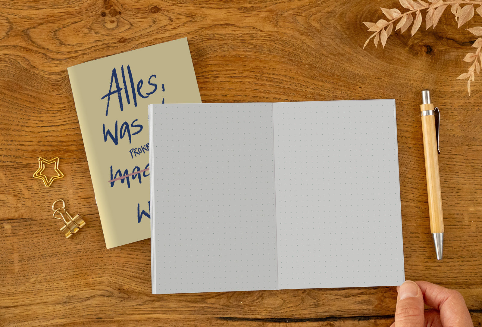 Mit Punktraster-Seiten, Softcover in Gelb/Blau und gedruckt auf hochwertigem Recyclingpapier begleitet es dich bei Gedanken, To-Dos oder kreativen Ausbrüchen – ohne gleich die komplette Weltplanung. Für alle, die lieber in Ruhe starten als im Hamsterrad landen.