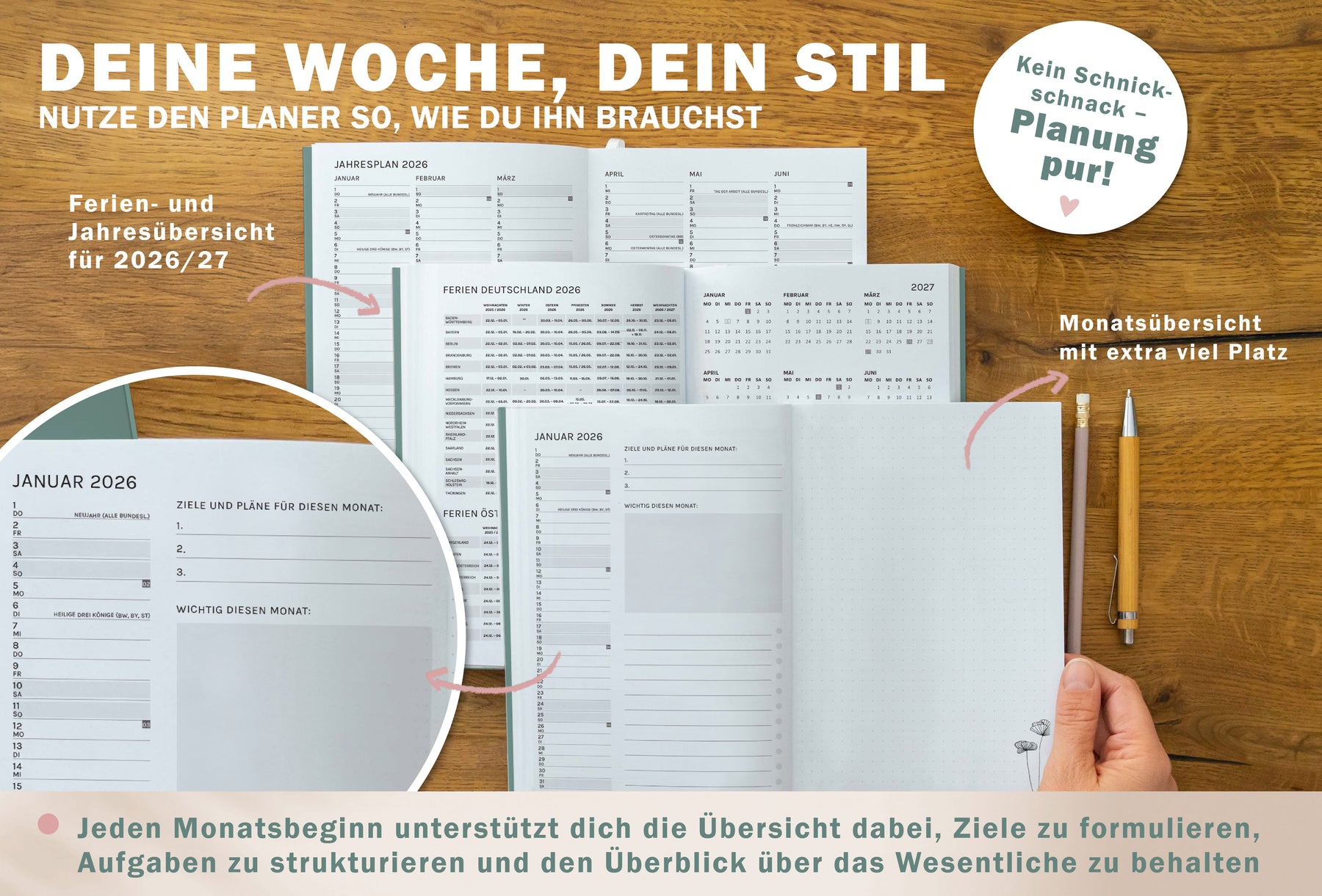 LANGFRISTIG DURCHDACHT: Behalte wichtige Termine und Fristen im Blick mit 4 Seiten Jahresübersicht 2026, Jahresplan 2027 und 12 Monatsübersichten inkl. Ferien & Feiertage (für Deutschland & Österreich).